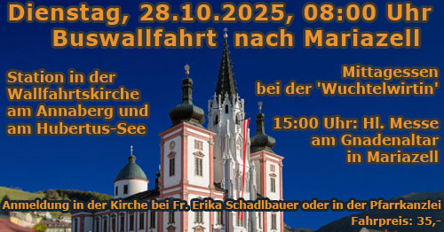 Unsere Pfarrherbstreise hat gut begonnen. 31 Damen und Herren machten sich auf den Weg. Nach einem Mittagsstopp beim Mondsee erreichten wir Maria Birkenstein in Bayern.