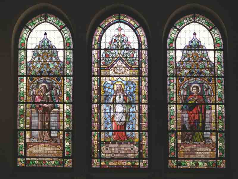 Neubau Platz gefunden! Der ursprüngliche Eindruck dieses Kirchenraumes war gänzlich anders, denn der Altarraum war mit Apostelfiguren von W. Schönerwald ausgeschmückt. Diese mussten bei der Generalsanierung 1937 einer Trinitätsdarstellung weichen und auch die mächtige Flachkuppel mit 14 m Durchmesser wurde neu bemalt (die vier Evangelisten), an den Wänden die Hauptgebete aus der heiligen Messe. Heute jedoch lässt die völlige Absenz von Wandmalereien den Hochaltar aus weißem Marmor (bezeichnet Rudolf Wiskoczil 1912) mit der Kreuzigungsgruppe (1841 von Pfarrer Lutner aus Spenden für die alte Kirche angeschafft) sowie die anderen Einrichtungsgegenstände der Kirche viel besser hervortreten. Von der ursprünglichen Einrichtung stammen der Josefs- und der Herz-Jesu-Altar in den Nischen der Querschiffarme sowie die Kreuzwegstationen und die Kanzel. Der polygonale Kanzelkorb ist mit Mosaiken geschmückt, die eine Darstellung des Herz Jesu, flankiert von den Heiligen Antonius von Padua, Johannes Ev., Petrus, Paulus und Clemens Maria Hofbauer zeigen. Auch hier wieder am Aufgang ein bemerkenswertes Gitter. Im linken Querhaus befindet sich der Marienaltar von Erich Pieler (1938/39). In den Flügelreliefs die Szenen der Verkündigung, Geburt Christi, Darbringung im Tempel und Beweinung. Dem Josefsaltar gegenüber ein Verkündigungsbild, 18. Jahrhundert aus der alten Kirche. Im rechten Querhaus, gegenüber vom Herz-Jesu-Altar, ebenfalls ein Bild aus der Wolfgangkirche, ein heiliger Hieronymus. (Ein drittes Bild mit einer Emmaus-Darstellung befindet sich in der Sakristei.) Auch die Kreuzwegstationen kommen durch die ungeschmückten Wände viel besser zur Geltung. Sie sind durchgehend als Hochreliefs in spitzbogigen Wandnischen mit seitlichen Halbsäulchen gestaltet. Die Orgelempore ruht auf zwei mächtigen Säulen mit neoromanischen Kapitellen. Die Orgel wurde 1935–1938 von Wilhelm Zika nach Josef Mertin gebaut. Im Brüstungswerk ein Trinitätssymbol mit der Aufschrift: „Soli Deo Gloria“. Die beidseitig bemalten Flügel zeigen im geöffneten Zustand je einen Engel auf Goldgrund mit der Aufschrift: „Das Himmelreich ist inwendig in euch“. Im geschlossenen Zustand sind das Apokalyptische Weib und der heilige Johannes auf Patmos zu sehen. Im rechten Querhaus ein monumentales Kruzifix aus der 2. Hälfte des 19. Jahrhunderts aus dem Vorgängerbau, davor Taufstein vom Ende des 18. Jahrhunderts mit Taufgruppe auf dem Holzdeckel. Das Kruzifix in der Werktagskapelle stammt ebenfalls aus der Wolfgangskirche, wie auch die schlichten Kirchenbänke des Langhauses. Diejenigen in der Vierung wurden für die neue Kirche angefertigt, die Kirchenbänke der Querhausflügel (mit neugotischem Dekor) kommen aus dem Priesterseminar in der Boltzmanngasse. Die Glasmalereien stammen großteils aus der Bauzeit. Im Chor drei Zwillingsfenster mit den Heiligen Franz Xaver und Barbara, Ludwig und Emilie, Josef und Magdalena. In den Querschiffen je drei Fenster; links Antonius von Padua (datiert 1911), Herz Mariae und Johannes Ev., rechts Johannes Nepomuk, Herz Jesu und Leopold, in der Werktagskapelle ein Glasfenster mit einer Pietà. Die drei Glasfenster der Sakristei mit eucharistischen Motiven (wie auch das dortige Kruzifix) wurden von Kanonikus Pax gestiftet. |